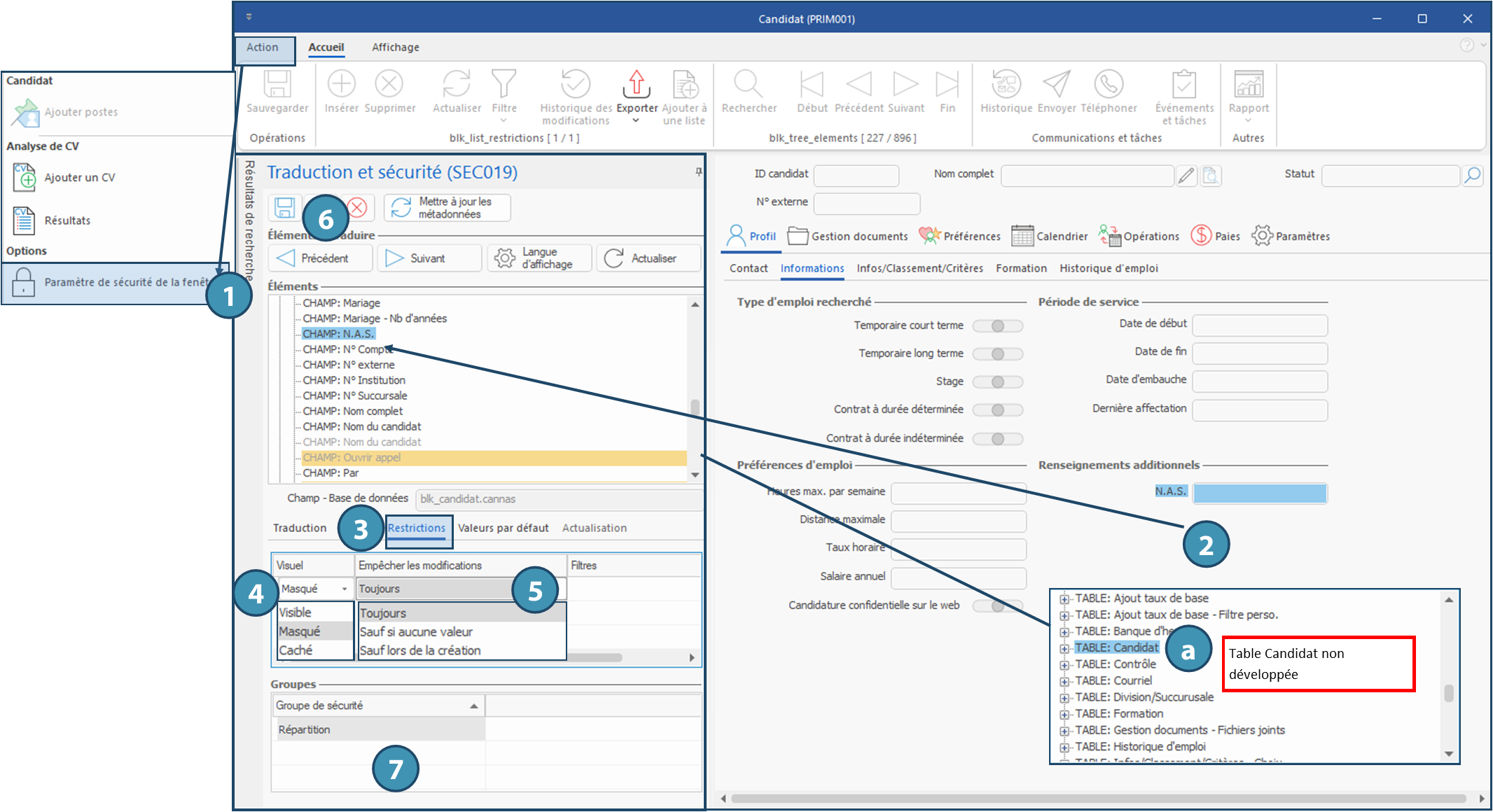 1.Ouvrez une fenêtre « Candidat » et à partir du menu Action, cliquez sur Paramètres de sécurité de la fenêtre. Le volet Traduction et sécurité (SEC019) s'ouvre. 2. Dans la liste des éléments de la fenêtre ou dans la fenêtre, repérez et sélectionnez l'élément sur lequel vous désirez ajouter une restriction. Dans ce cas-ci, le champ « N.A.S ».