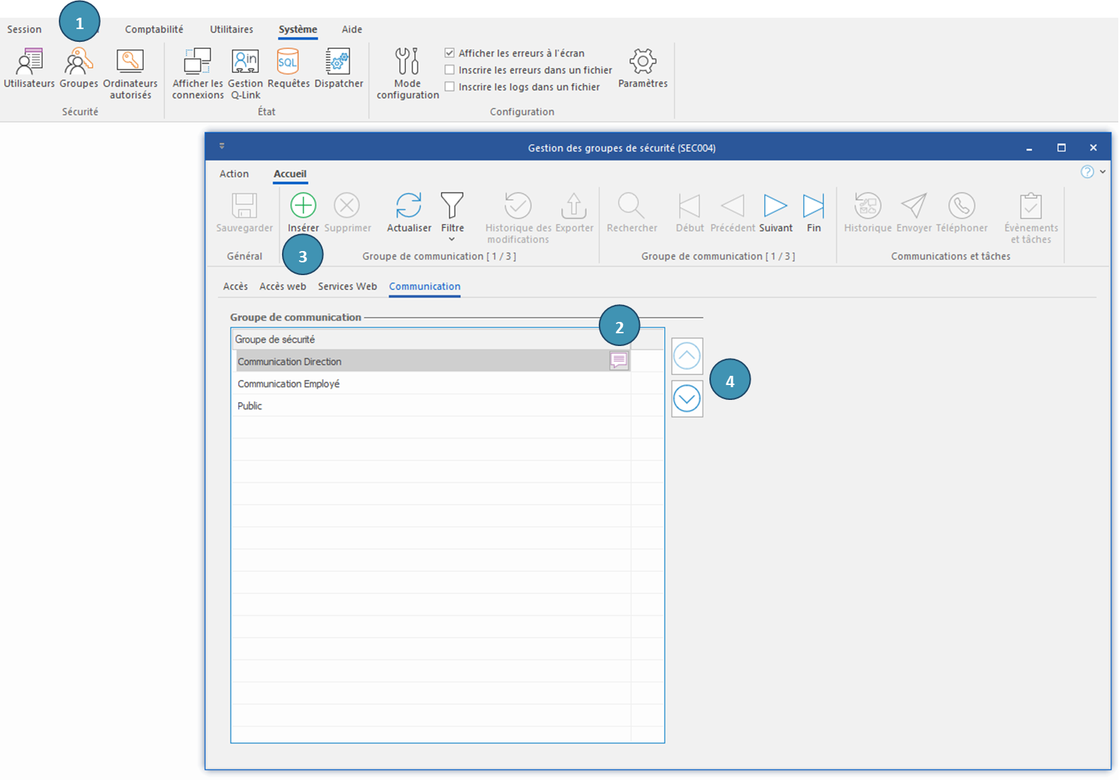 1.Dans le ruban Système, cliquez sur Groupes pour ouvrir la fenêtre de Gestion des groupes de sécurité et déplacez-vous dans l’onglet Communication.
