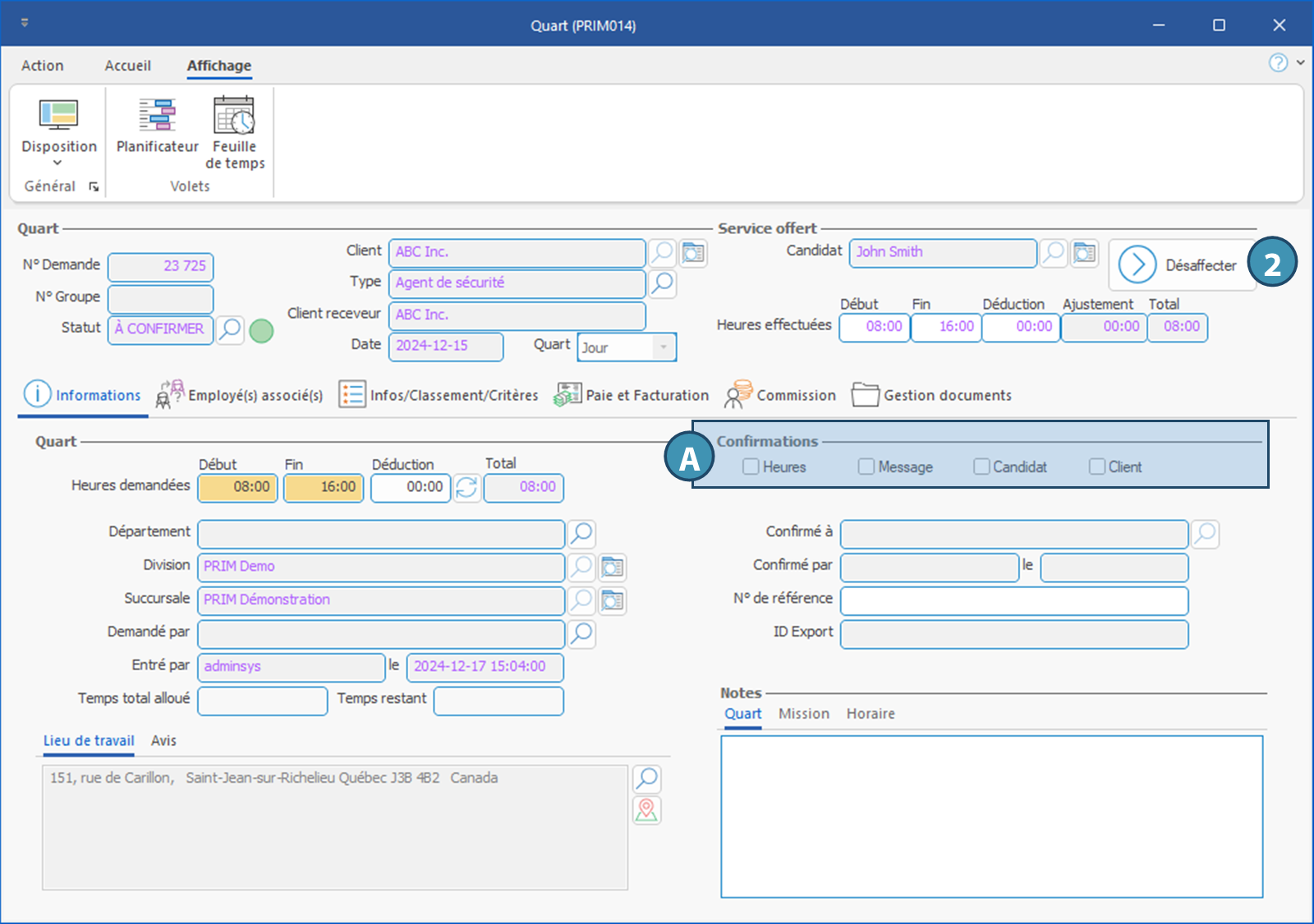 Il est possible de cocher les cases indiquant que l'affectation a été confirmée avec le candidat et avec le client directement dans la fiche du quart, et même de confirmer les heures effectuées. Ces cases s'affichent dans l'onglet Informations, section Confirmations (A).