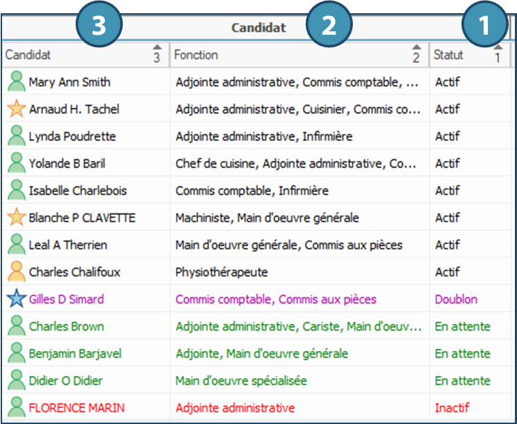 Dans l'exemple ci-dessous, l'utilisateur a fait un tri en 3 étapes et sur 3 colonnes : le statut, la fonction et le nom du candidat.