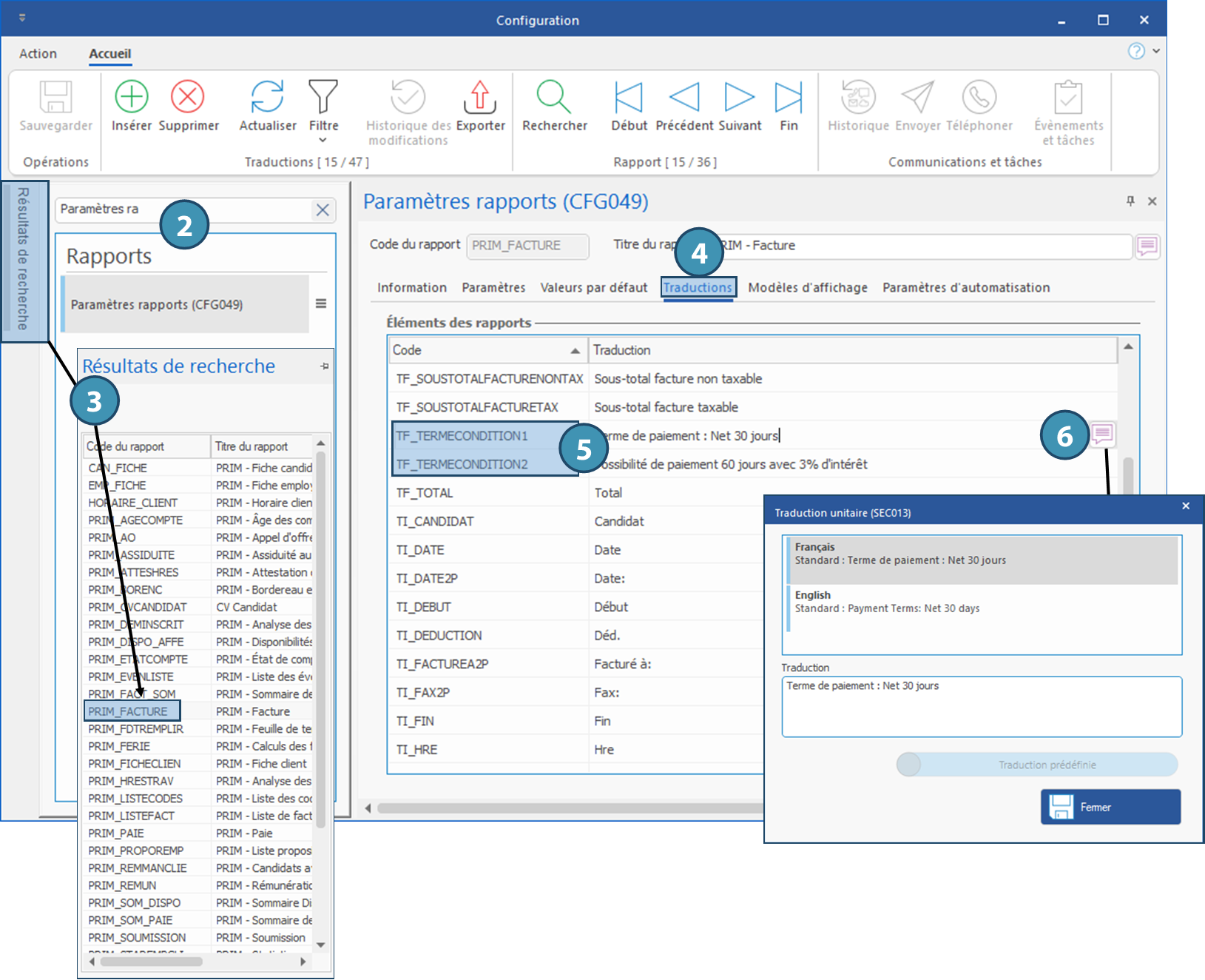 2.Recherchez et lancez la fenêtre Paramètres rapports (CFG049).