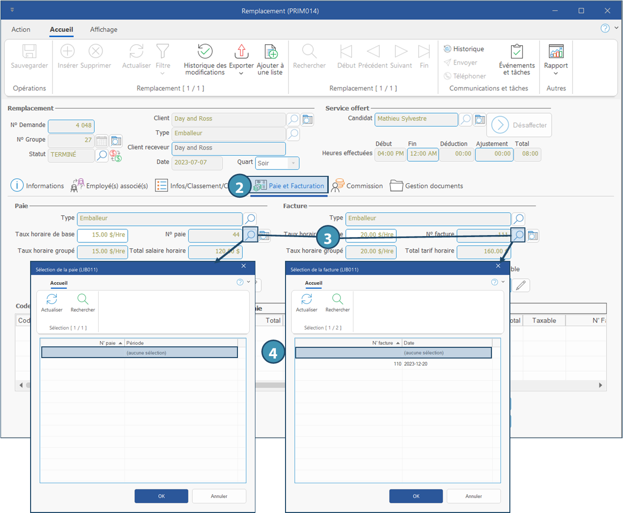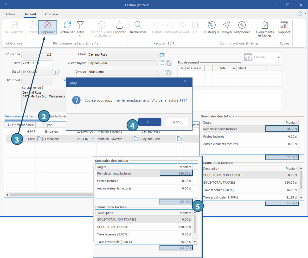 Dans l'exemple ci-dessous, on retire un élément d'une facture. La procédure pour retirer un élément d'une paie est expliquée, mais non illustrée.