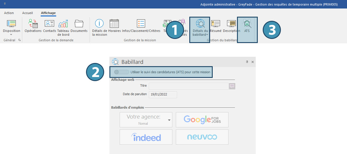 L’ATS est l’outil utilisé pour effectuer le suivi des candidatures dans un poste. Dans une fenêtre « Poste » ou « Gestion des postes », cliquez sur le bouton « ATS » dans le ruban Affichage pour l’ouvrir.