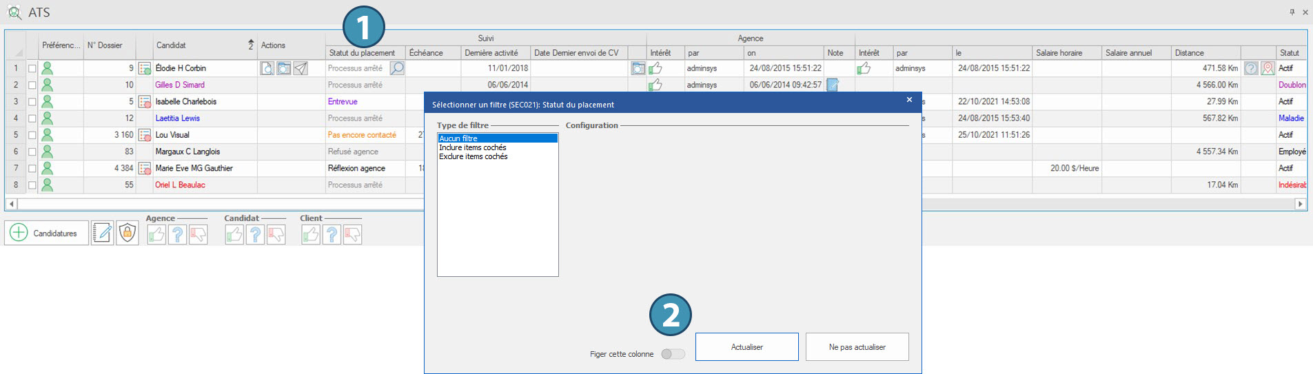 Afin de rendre la consultation du tableau de l’ATS plus fluide, il est possible de figer certaines colonnes afin d’en bloquer le défilement horizontal. Pour ce faire, faites un clic-droit sur l’en-tête de la colonne et activez le bouton « Figer cette colonne » dans la fenêtre de sélection des filtres.