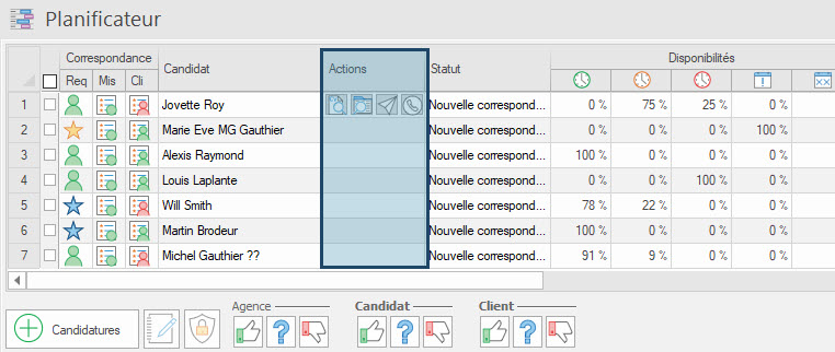 Utilisez le bouton d’envoi de courriel/sms du ruban Accueil pour communiquer avec plusieurs ou tous les candidats affichés dans le planificateur, en cochant la case au début de chaque ligne. Afin de réduire ou d’augmenter le nombre de candidats affichés, utilisez des filtres.