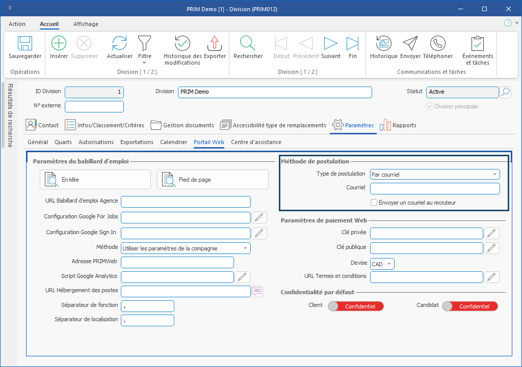 1.Babillard d'emplois - nouveau paramètre de division pour la postulation par courriel (voir image)